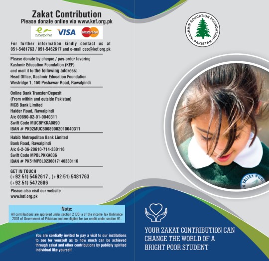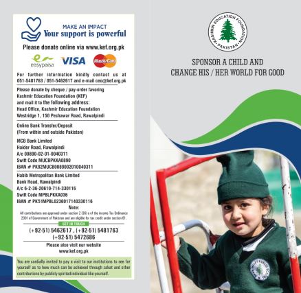 Kashmir Education Foundation (KEF is a charitable Eductaional Trust registered in Pakistan and Azad Kashmir and is certified by Pakistan Centre of Philanthropu (PCP). KEF is currently running three schools which provide mordern quality education to bright children from marginalized sections of the society in the rural areas of Azad Kashmir and Punjab. KEF has also established Teacher Training Institute to improve the standard of education being provided in schools across Pakistan and Azad Kashmir